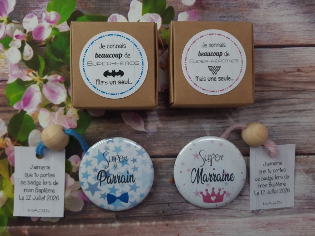 Le badge pour la marraine sera au prénom de la Marraine avec la mention "Marraine en Or + prénom de l'enfant et le jour du Baptême"