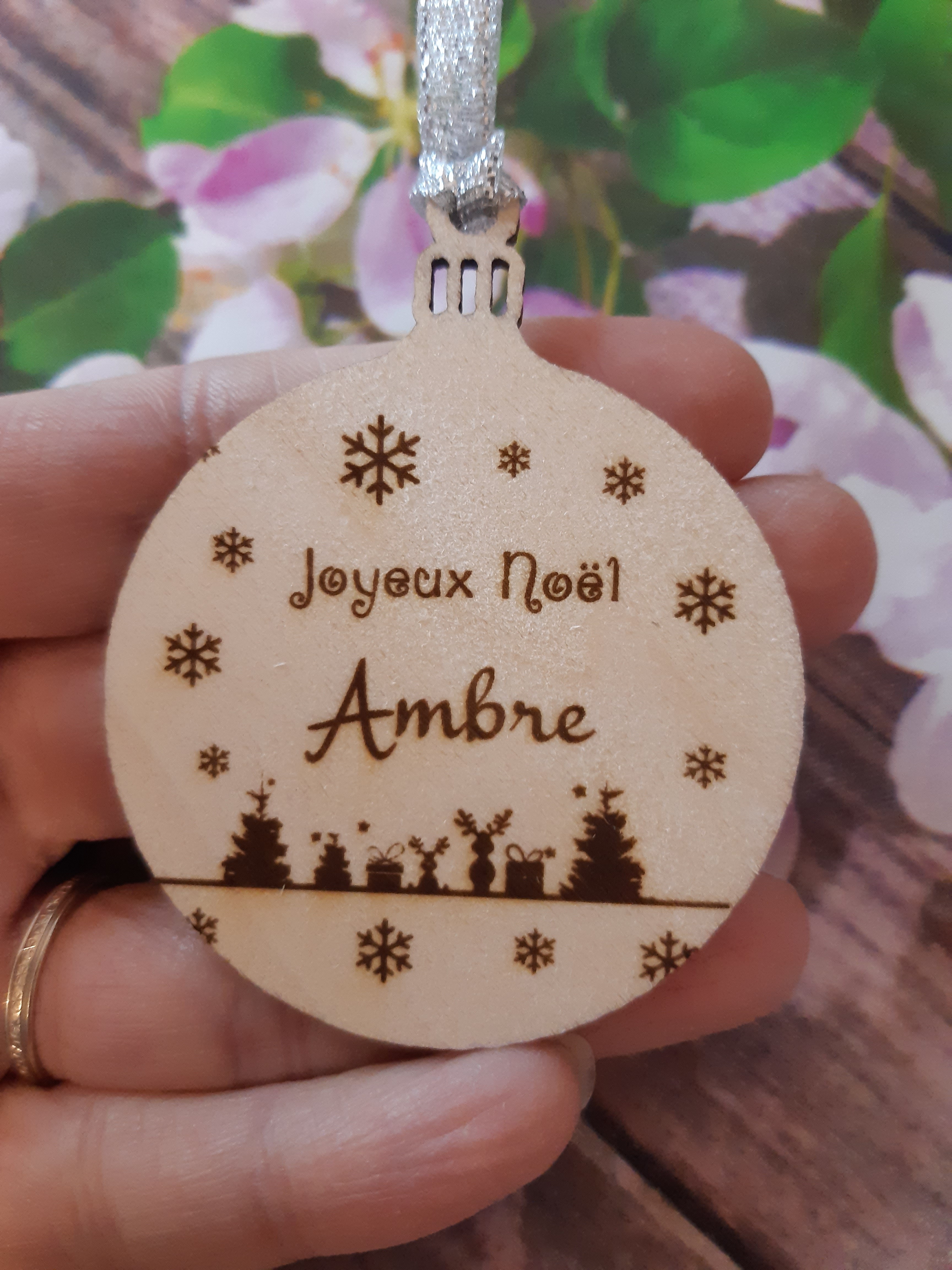 La boule mesure 50mm de diamètre, elle sera décorée sur une seule face et portera soit la mention Joyeux Noël + le prénom que vous aurez choisi d'y inscrire ou uniquement le prénom de vore choix. Afin de rappeler la saison hivernale, des flocons sont gravés sur le support ainsi qu'une petite frise de Noël.